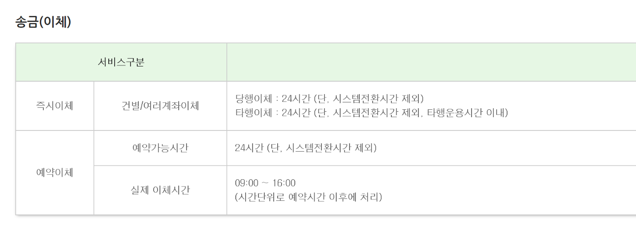 송금이나 이체의 경우 24시간동안 이용이 가능한데